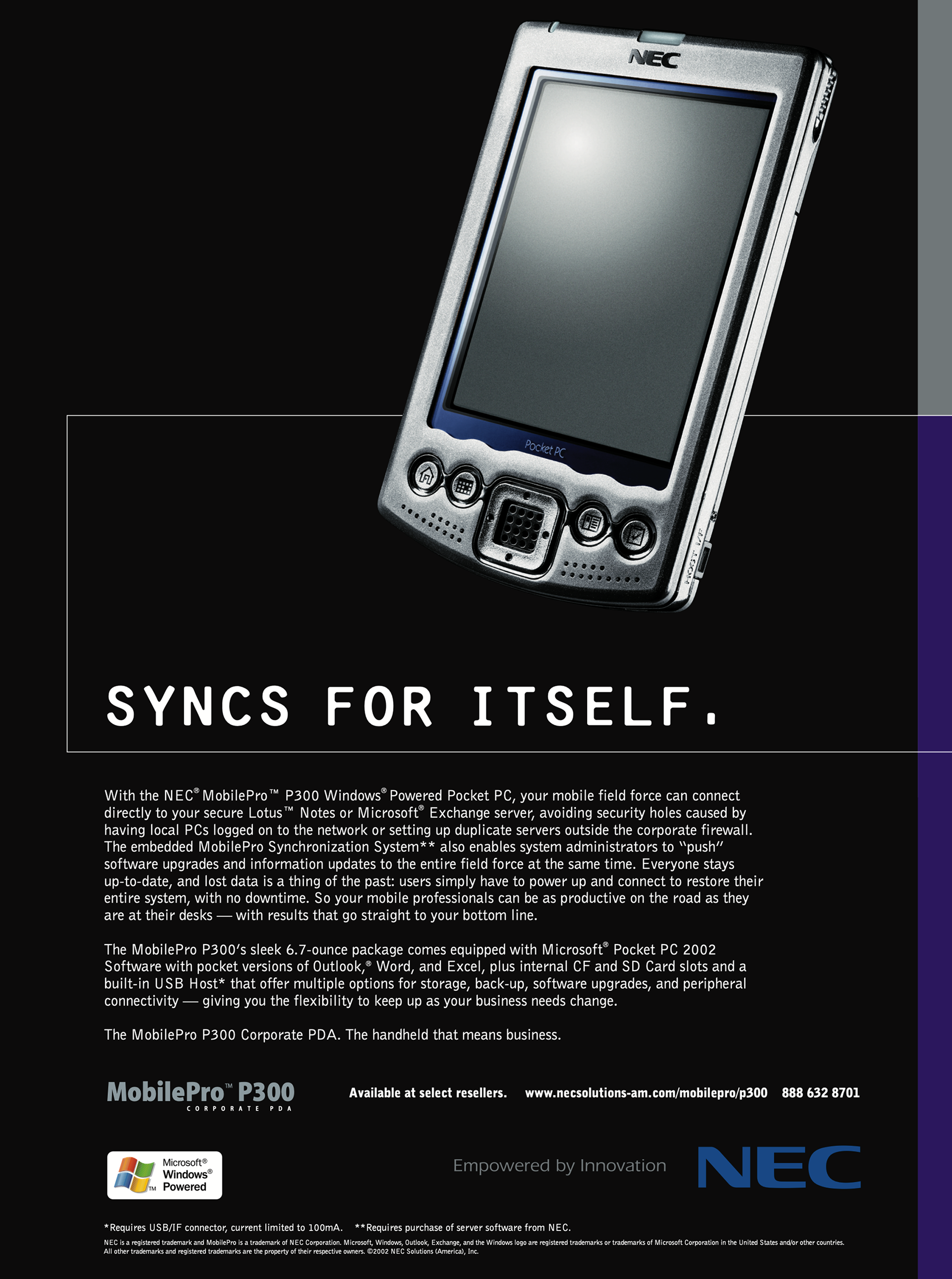 The solution was to remember that enterprise users are consumers, too. We photographed the MobilePro P300 like a luxury watch, and tied product design and tech specs together with playful copy that called attention to the device’s aesthetics. So even though the NEC P300 means business, it also has a sense of fun.